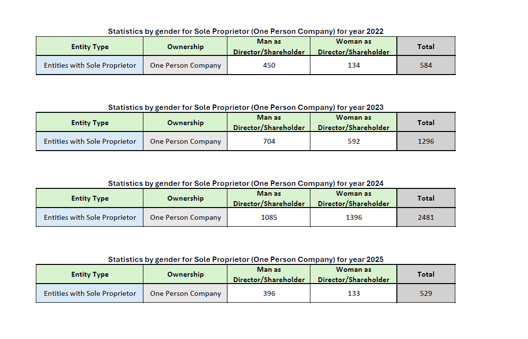 Statistics by Gender for Sole Proprietor (One Person Company) for Year 2022-2025
